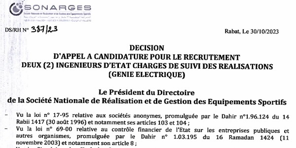 كونكور جديد با الشركة الوطنية لإنجاز وتدبير المنشآت الرياضية في بعض الدرجات والتخصصات، آخر أجل هو 14 نونبر 2023