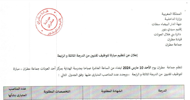 مباراة توظيف 5 مناصب بجماعة مطران إقليم سيدي بنور 2024