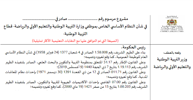 مشروع مرسوم في شأن النظام الاساسي الخض بموظفي وزارة التربية الوطنية والتعليم الأولي والرياضة