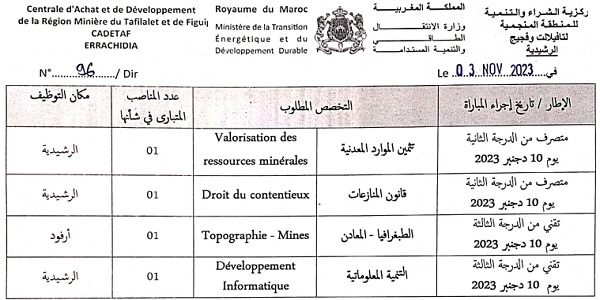 Al Wadifa كونكور جديد با مركزية الشراء والتنمية للمنطقة المنجمية لتافيلالت وفجيج (CADETAF) (04 منصب) ، آخر أجل هو 21 نونبر 2023 Lire la suite