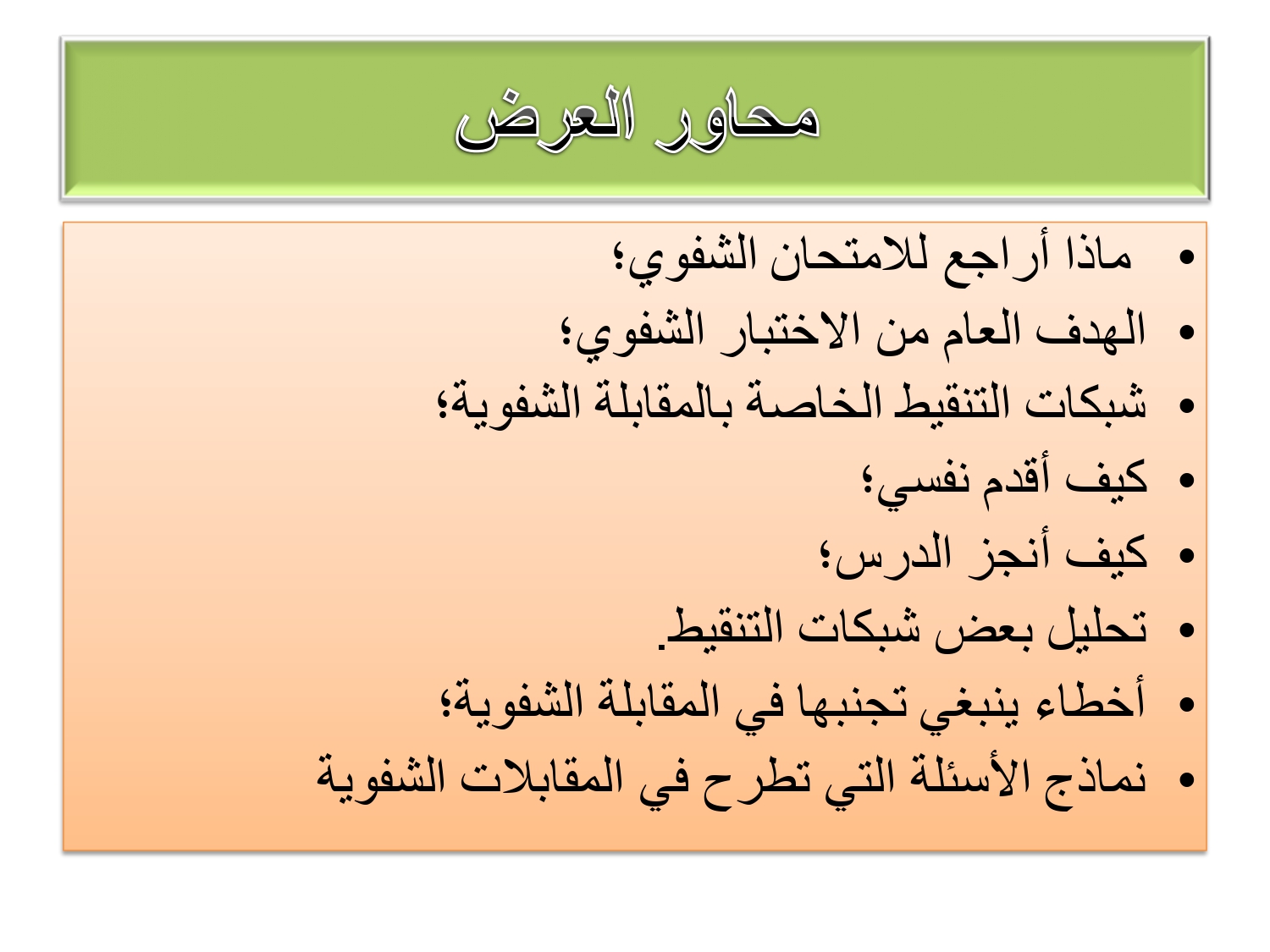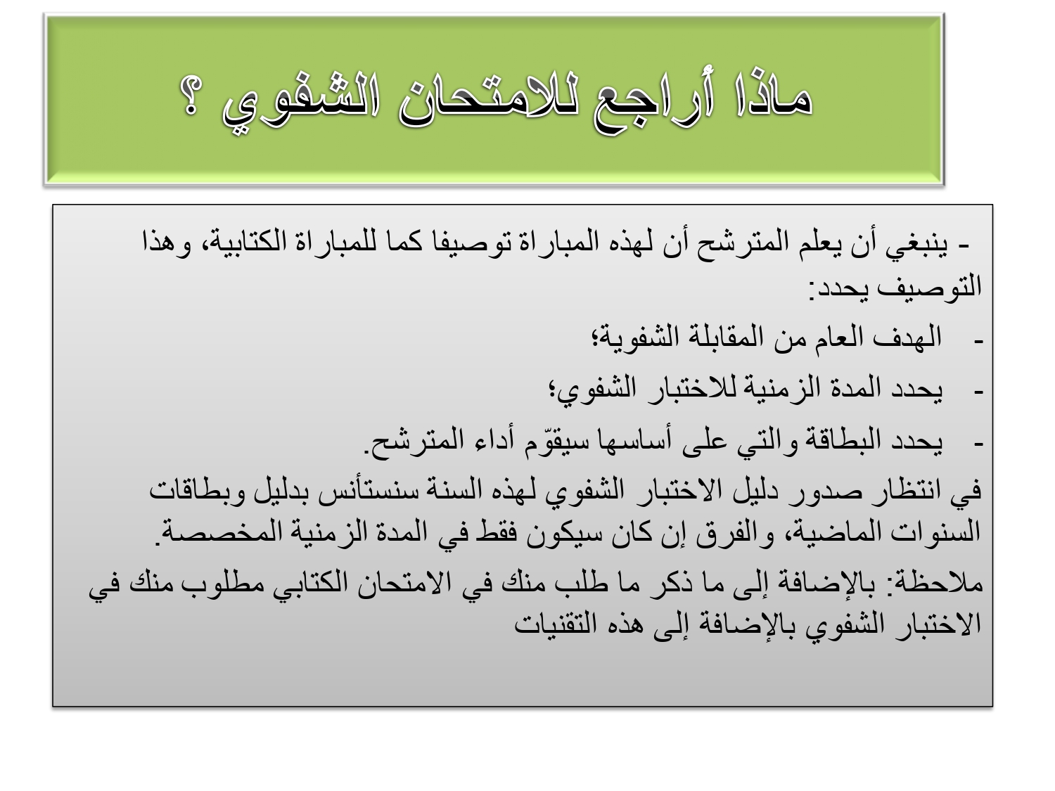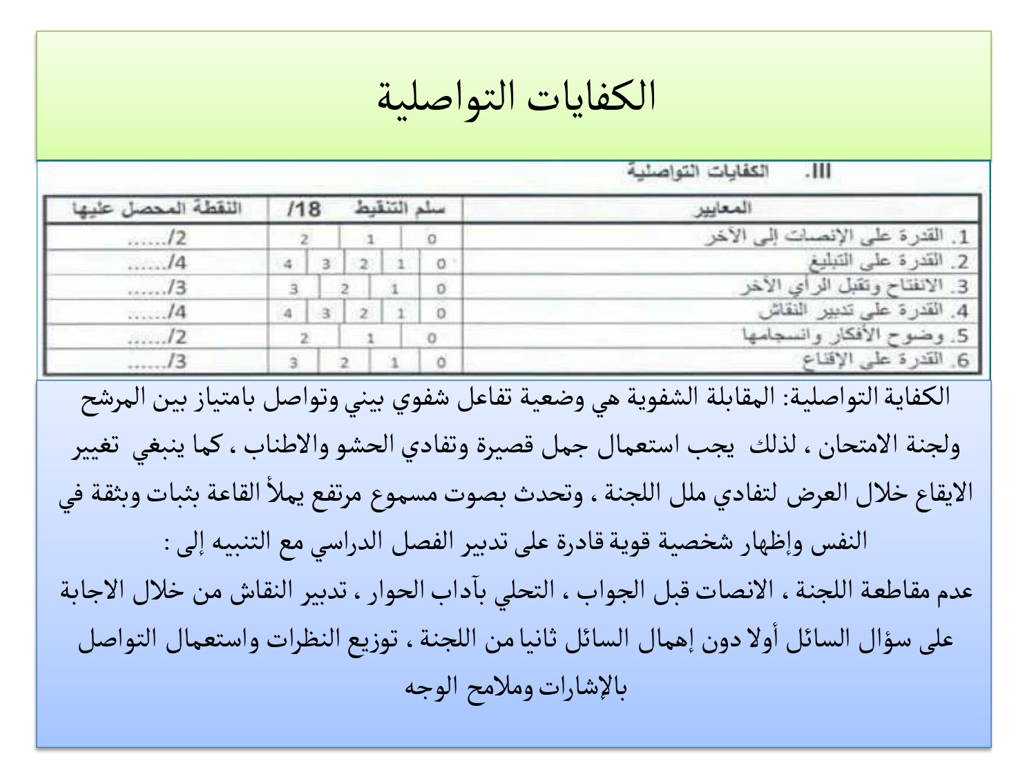 • السبورة: إذا طُلب منك تقديم مقطع من درس، استخدم السبورة بشكل منظم (التاريخ، العنوان، محاور الدرس). اكتب بخط واضح.