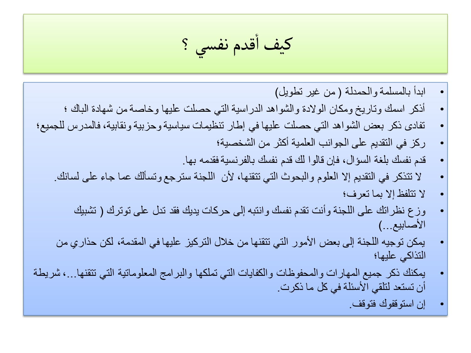 • قد يتعمد أحد أعضاء اللجنة استفزازك (مثلاً: « هل تعتقد حقاً أنك تصلح للتدريس؟ » أو مقاطعتك باستمرار).